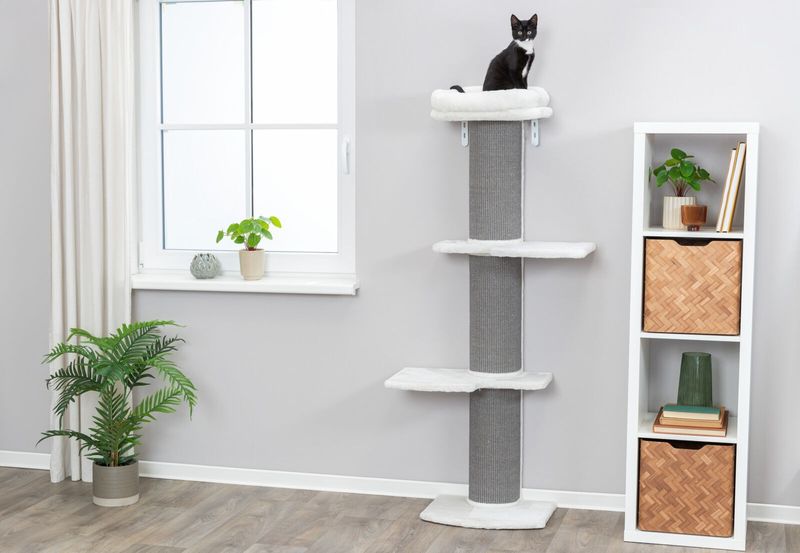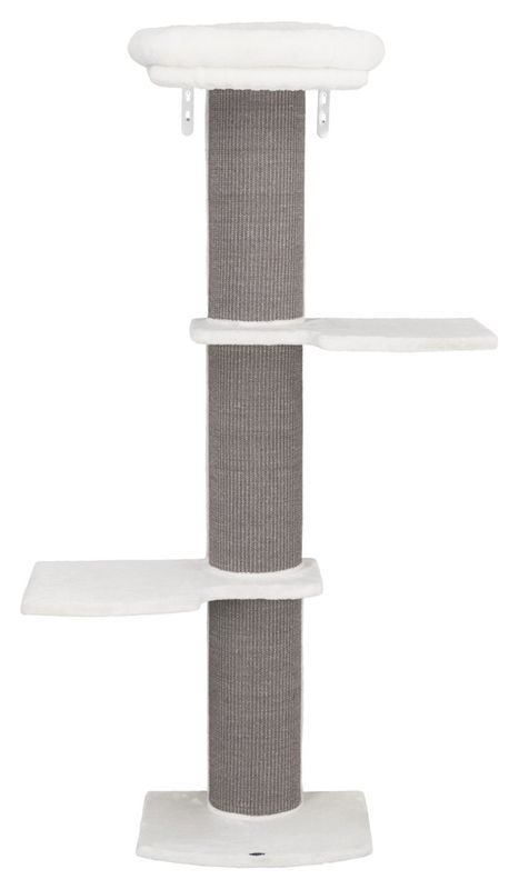 Snyggt klösträd med vita hyllor med plysch, överst finns en avtagbar kattbädd som går att tvätta i handtvätt. Sisalpelarna är klädda med en neutral grå sisalväv.
