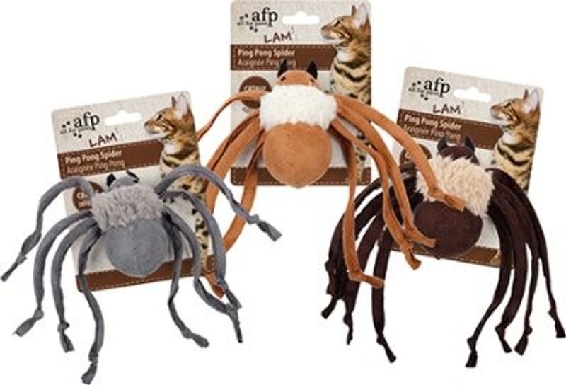 Alla små och stora hemmatigrar ger sig någon gång då och då, när tillfälle erbjuds, på det här med spindeljakt. Nu har den stora jägaren chansen på ett riktigt läckert byte! Spännande spindel med tygklädd pingpongboll till kropp och åtta långa mjuka ben som gjorda för att bita tag i när bytet ska släpas hem. Pingpongbollen gör spindeln lätt för katten att bära eller kasta omkring i luften.