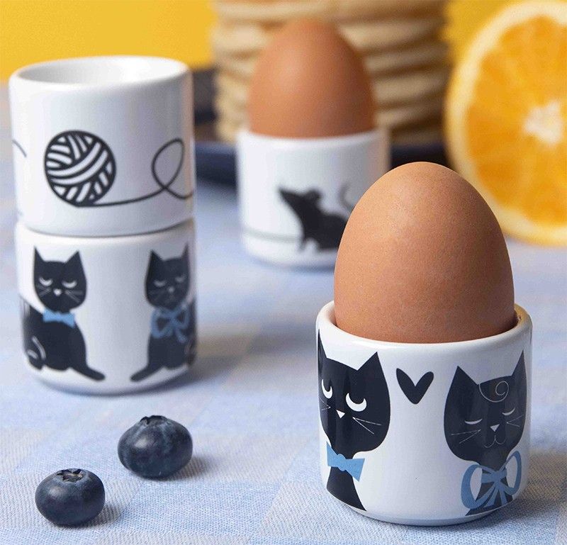 Superfint set med 4 st äggkoppar, vit keramik med kattiga motiv. Perfekt att duka upp till helgfrukosten med familjen, eller brunschen med dina vänner! Pryder sin plats på bordet.