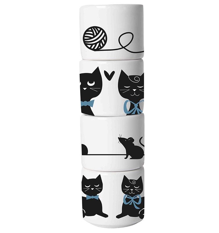 Superfint set med 4 st äggkoppar, vit keramik med kattiga motiv. Perfekt att duka upp till helgfrukosten med familjen, eller brunschen med dina vänner! Pryder sin plats på bordet.
