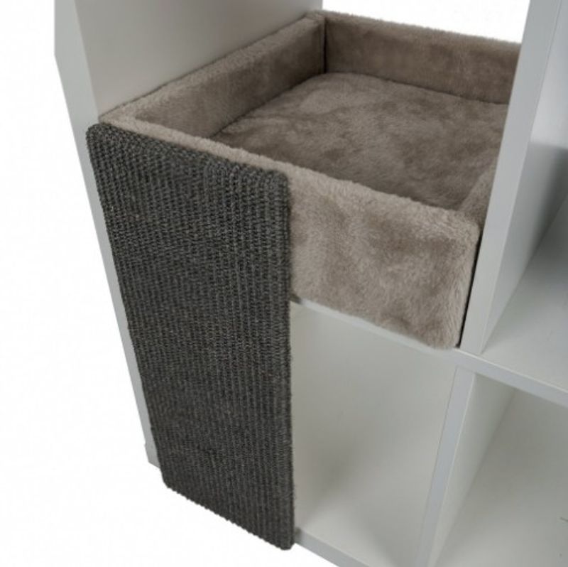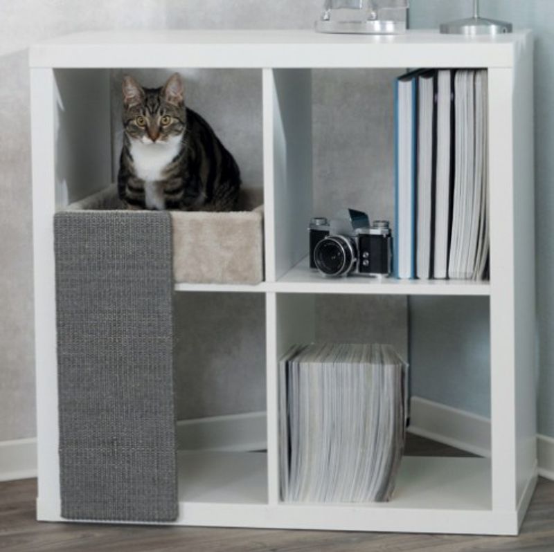 Smart och mysig kattbädd som passar till IKEAs möbler Expedit och Kallax. Det medföljer en klösbräda i sisal som skruvas fast på utsidan, och ger denna bädd en extra funktion. Själva bädden är gjord av spånskiva och klädd med grå plysch. En mjuk dyna medföljer.