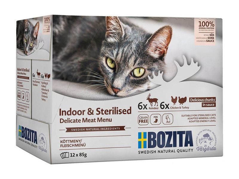 Det populära och svensktillverkade kattmatsmärket Bozita släpper ny denna nya multibox-meny. 12 smaskiga enportionspåsar med olika kött-smaker, som passar perfekt för innekatten. Fodret är anpassat för inomhus- och steriliserade katters något mindre energibehov, vilket dessutom gör att det passar för äldre och överviktiga katter.