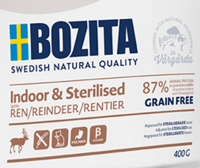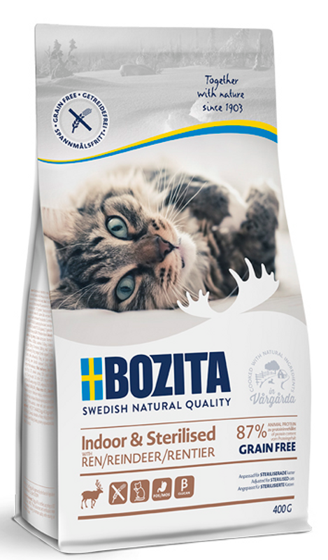 Bozita Grainfree Indoor & Sterilised med renkött är ett helfoder för den mindre aktiva katten - passar till innekatt och steriliserad katt, men även till äldre eller överviktiga katter. Receptet med ren och kyckling är anpassat till katter med lägre energibehov, och är lämpligt för att kontrollera kattens vikt. Receptet är lättsmält, så att katten lättare kan tillgodogöra sig alla näringsämnen.