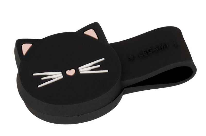 Svart band med två magneter i varsin ände, kattmotiv. Många användningsområden, kan t ex hålla ihop hörlurssladdar och kablar, hålla fast en penna i en anteckningsbok eller hålla ihop en bunt papper.