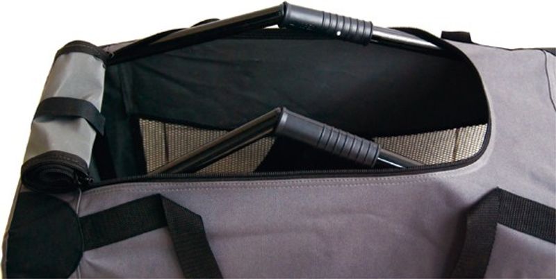 Det finns små fickor med kardborre på båda sidor med plats för smått och gott. Bärhandtag finns upptill och metallramen gör transporten stabil att bära.