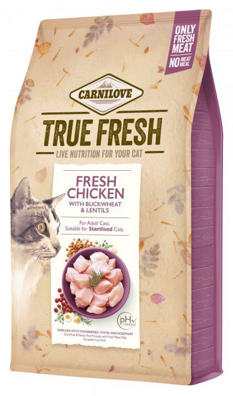 True Fresh från Carnilove är ett mycket smakrikt torrfoder med ett högt köttinnehåll och en speciell tillverkningsprocess. Köttet i True Fresh Cat Kyckling processas i färskt tillstånd, vilket gör fodret väldigt välsmakande för katten, och dessutom mer lättsmält. Det här sättet att tillverka torrfoder bevarar ingrediensernas ursprungliga egenskaper - till och med den kräsna katten brukar uppskatta den naturliga smaken hos True Fresh torrfoder.