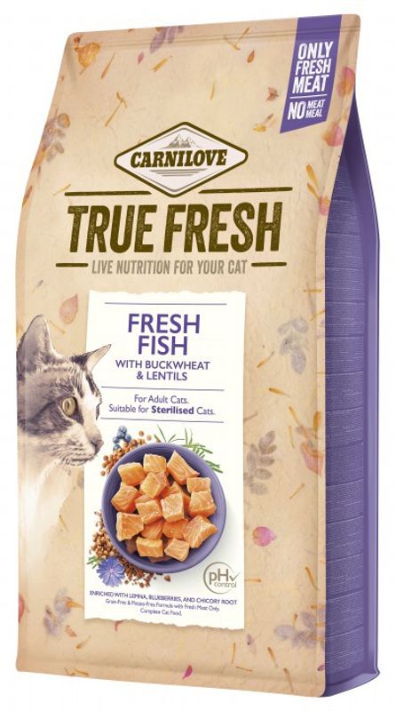 True Fresh fish från Carnilove är ett välsmakande torrfoder med ett högt fiskinehåll och speciell tillverkningsprocess. Fisken i True Fresh Fish processas i färskt tillstånd, vilket gör det här torrfodret väldigt smakrikt och mer lättsmält. Den här tillverkningsprocessen bevarar ingrediensernas ursprungliga egenskaper - till och med den kräsna katten brukar uppskatta den naturliga smaken.