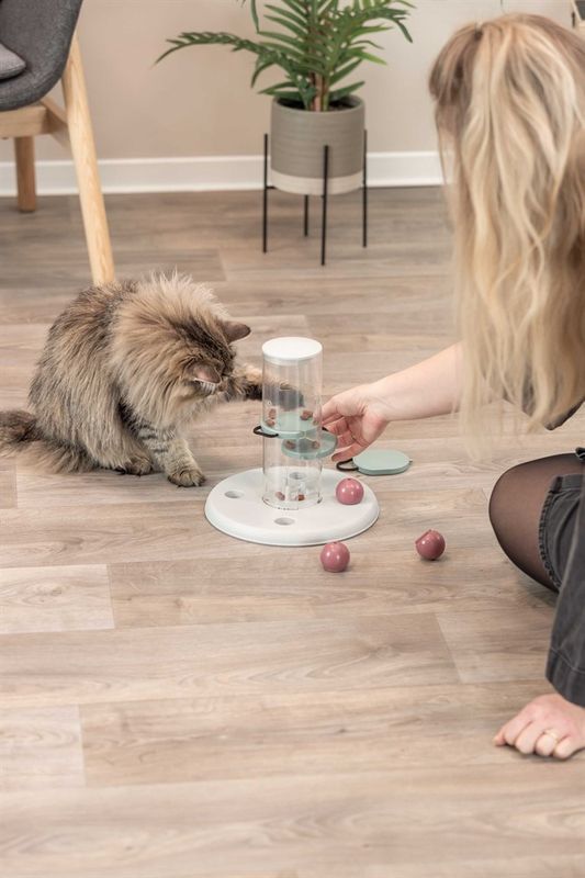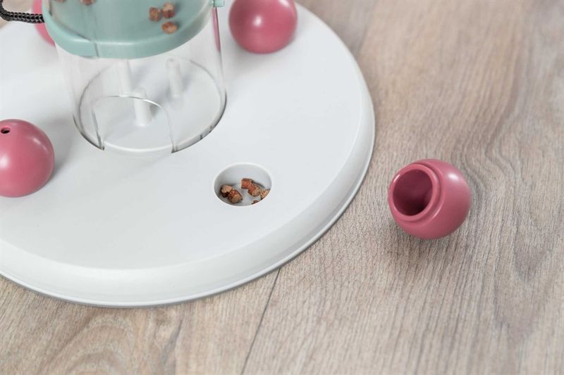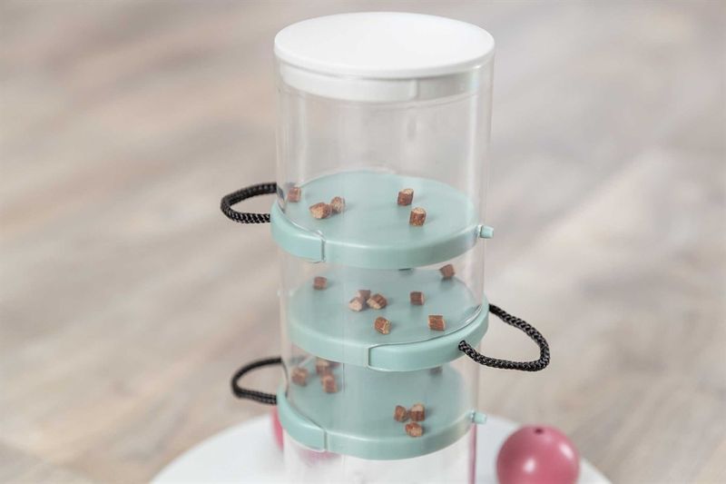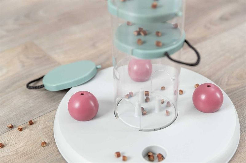 Stoppa godisbitar eller den dagliga givan med torrfoder i behållaren upptill, för att få ut dem måste katten dra ut de 3 diskarna så att torrfodret ramlar neråt och sen fiska fram godisen bland piggarna i basplattan. Under kupolerna i bottenplattan ryms det även lite torrfoder eller godis.