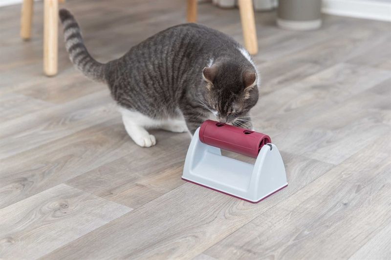 Fyll rullen med din katts favoritgodis eller torrfoder, ställ fram leksaken och låt din katt undersöka den och nosa sig fram till godisgömman. Visa din katt hur man rullar på leksaken och låt det trilla ut några godisar så att din katt förknippar leksaken med belöning = godis.