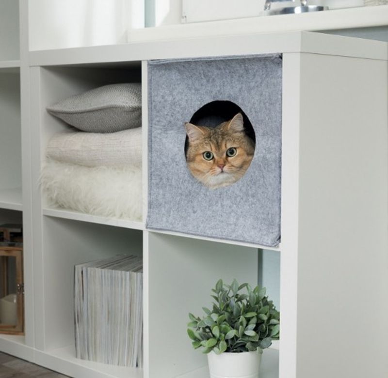 Funktionell och smart kattgömma som passar till IKEAs möbler Expedit och Kallax. Cat cave Anton leveras i ett platt paket och fälls upp för att passa i din Expedit eller Kallax-möbel. Mysigt och framförallt en stilren kattgömma som passar perfekt in bland övrig möblering i hemmet. Lägg in en mysig liten fleecefilt och din katt kommer att älska sin hide-away i hemmet!