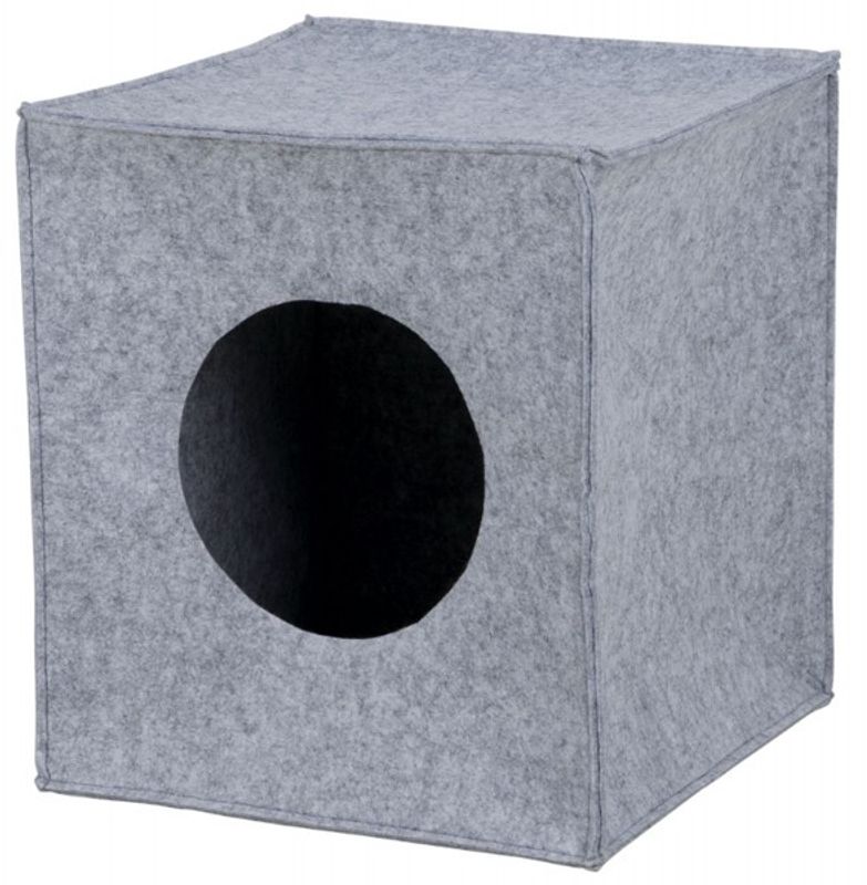 Cat cave Anton är tillverkad i ljusgrå filt (polyester) och är lätt att fälla ihop och förvara som platt paket under tider när den inte används.