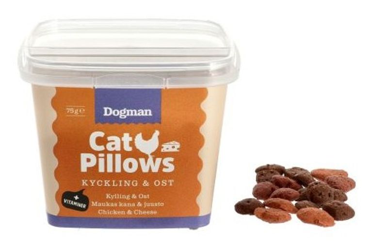 Vitaminberikat godis till din kissemiss, små kuddar med knaprig utsida och en creme-fyllning med kyckling och lax inuti. Förpackat i praktiskt plastburk som håller godiset fräscht samt skramlar inbjudande när man skakar på den.