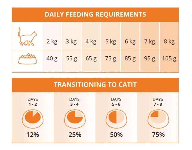 Börja i liten mängd att blanda i CatIts torrfoder i din katts tidigare foder. Öka mängden Catit-recept varje dag och minska deras gamla mat, under en period av ca 8 dagar. Se till att alltid ha friskt vatten tillgängligt för din katt.