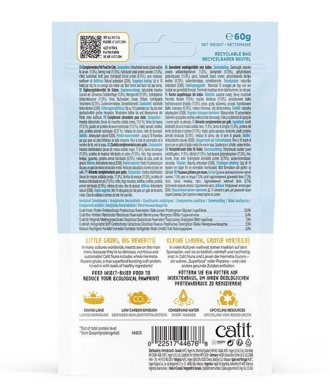 CatIt Nuna erbjuder smaskiga godsaker som består av blandningar av insektsprotein med antingen äkta kyckling eller MSC-certifierad sill, samt ett speciellt medley av våra klassiska Hermetia Illucens och näringsrika mjölmaskar.