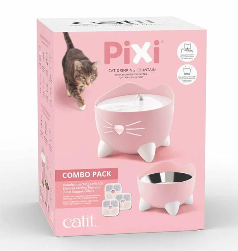 I detta prisvärda paket har CatIt packat ihop sin populära rosa vattenfontän i PIXI-serien tillsammans med en rosa upphöjd ergonomisk matskål (som ej går att köpa separat i rosa färg). De har även lagt med 3 st filter i paketet så att du har 3 filterbyten till fontänen. I paketet finns även 1 extra insatsskål (rostfri) som passar i matskålen, så att det är lätt att ha en matskål framme och en t ex i disken.
