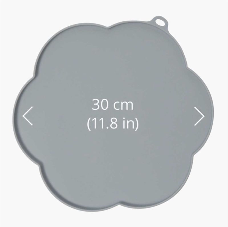 Mattan i en stilren grå färg är snyggt formad som en blomma och mäter 30 cm i diameter. Silikonunderlägget har en hänge så att den lätt kan hängas upp på tork efter rengöring.