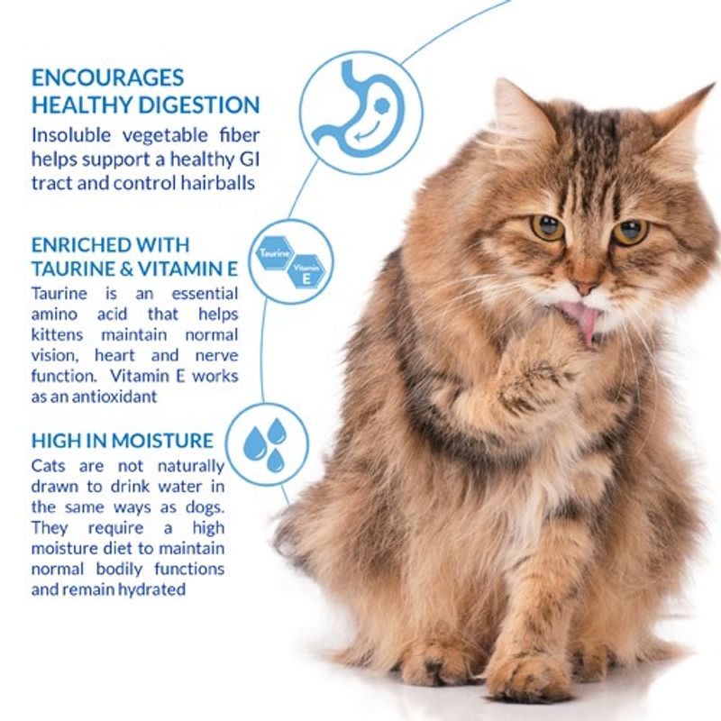 - Med vitamin E för immunitet och taurin för allmän bra katthälsa