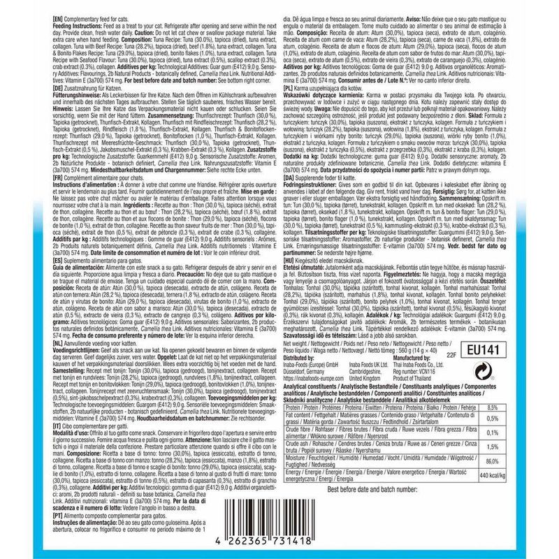 Water, Tuna, Tapioca Starch, Natural Flavors, Guar Gum, Natural Tuna Flavor, Natural Scallop Flavor, Natural Crab Flavor, Vitamin E Supplement, Taurine, Green Tea Extract