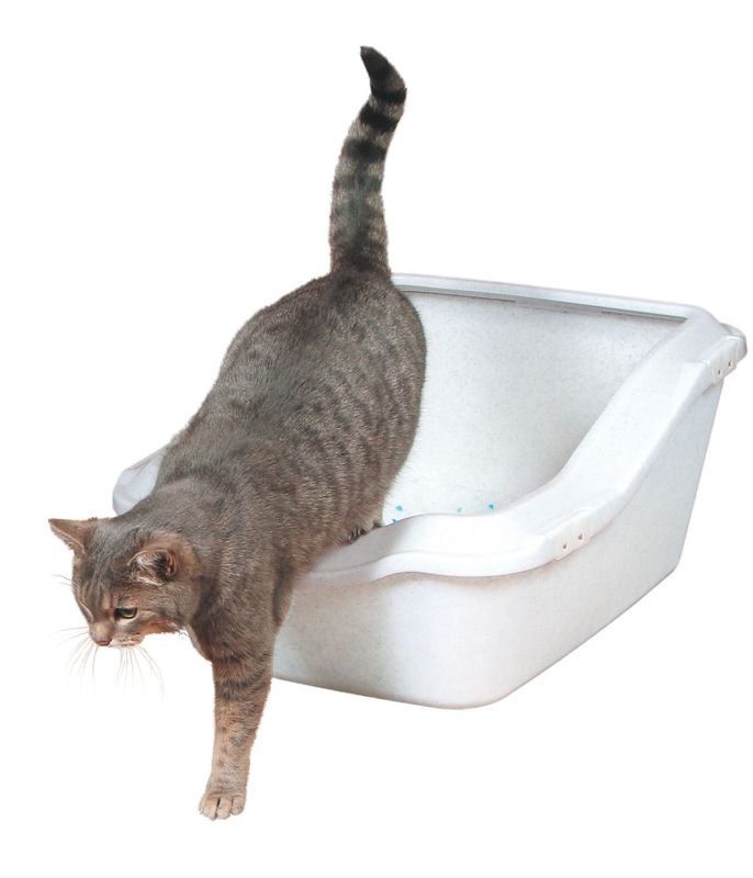 Cleany Cat är en öppen kattlåda med hög kant baktill för att förhindra urinläckage, ingången framtill är något lägre för kattens bekvämlighet.