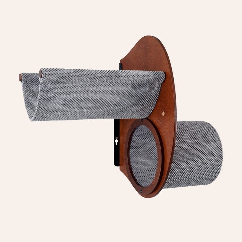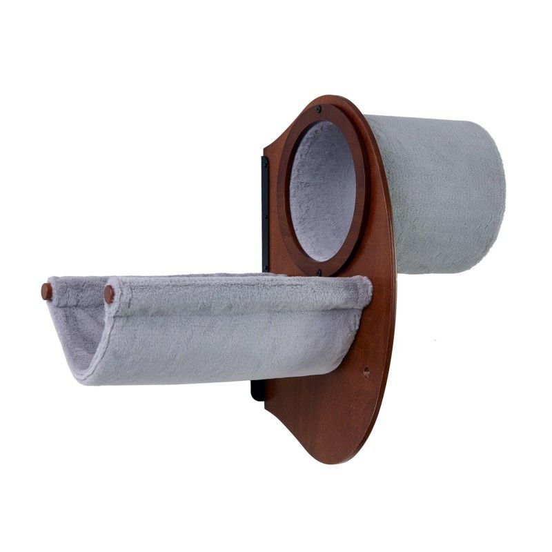 Katthyllan är tillverkad i valnötplywood och har snyggt möbeltyg på både hammock och tunnel.