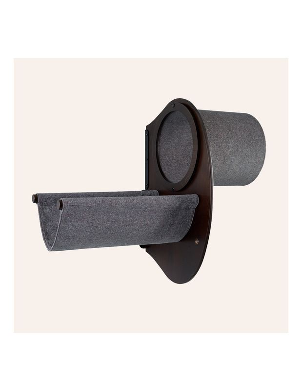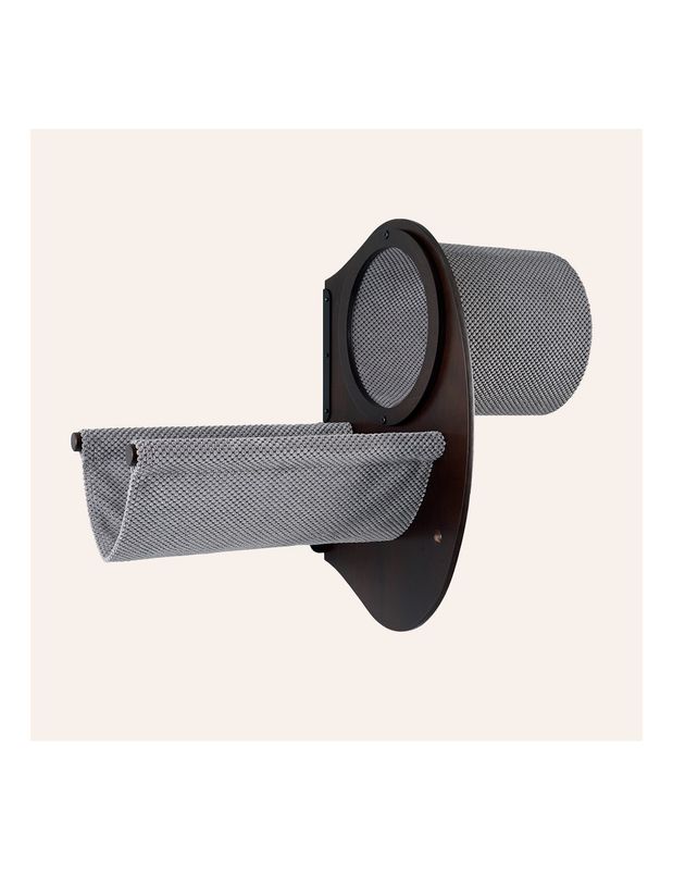 Just den här katthyllan är tillverkad i wenge-träplywood och har snyggt möbeltyg på både hammock och tunnel. Wenge är ett mörkt afrikanskt träslag som skiftar lite i violetta toner.