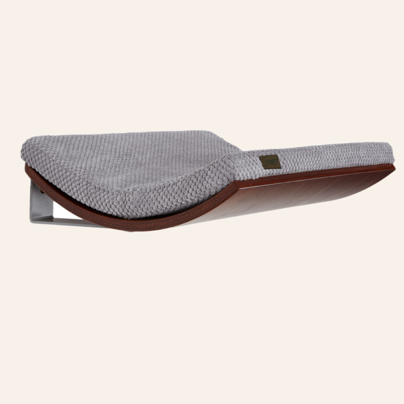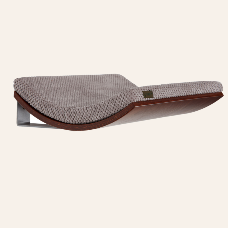 Katthyllan är tillverkad i valnötplywood och ovanpå ligger en extra stor mjuk kudde i snyggt möbeltyg/ flufftyg. Kudden fästs med tryckknappar, så att den inte rör sig när din katt ligger på den. Alla hyllkuddar från Cozy and dozy är maskintvättbara. CHILL katthylla skapar en mysig sovplats för din kisse!