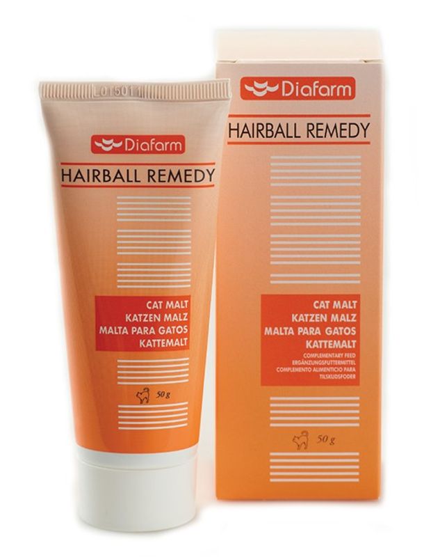 Kattmalt från märket Diafarm, en produkt lämplig att ge din katt för att motverka att hårbollar bildas i kattens matsmältningssystem. Maltpastan kan ges direkt till katten från fingret, eller blandas i kattens mat.