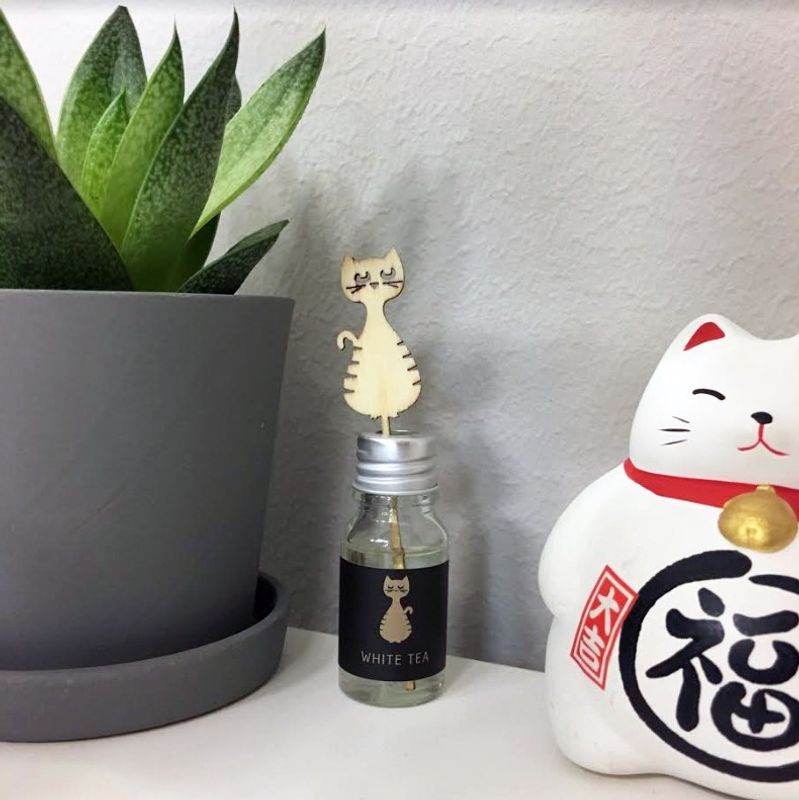 Söt liten doftflaska med en träpinne i form av den sittande Katten från märket Pluto Produkter. Doften är "white tea" och är mycket behaglig.