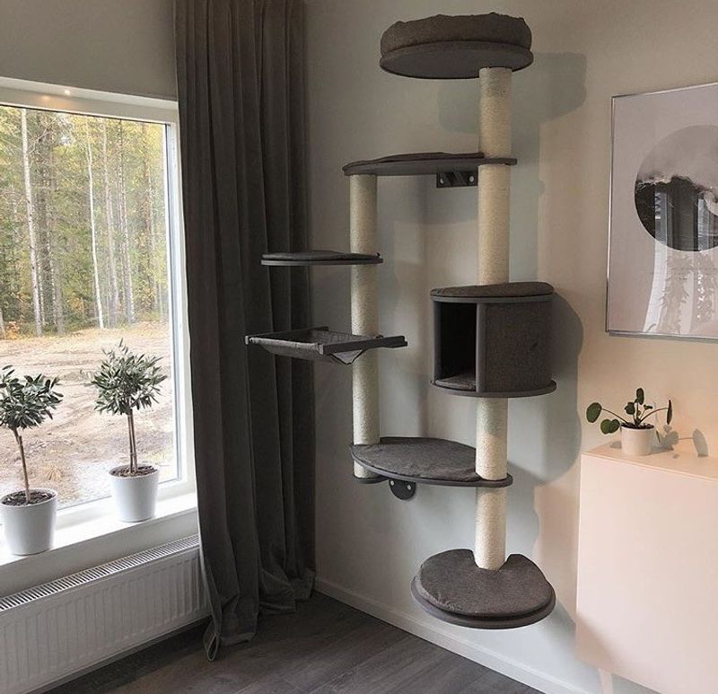 Trädeljarna kan göras om med lite målarfärg! Grå eller vita trädetaljer för ett stilrenare klösträd som smälter in i hemmet, eller kanske en accentfärg för att piffa upp klösträdet lite extra?! Sista produktbilden visar ett klösträdat målat med en grå färg, supersnyggt! (se kundfoto bland produktbilderna med grå hyllor)