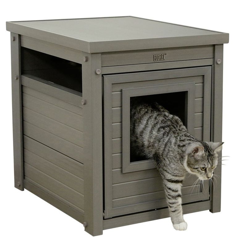 Fin kattmöbel tillverkad i återvunna material, 60% plast och 40% trä. Möbeln är vattentätt och underhållsfri, UV- och väderbeständigt och kan pga materialegenskaperna inte ruttna. Kattmöbeln är enkel att rengöra genom fronten, fronten har magnetlås upptill.