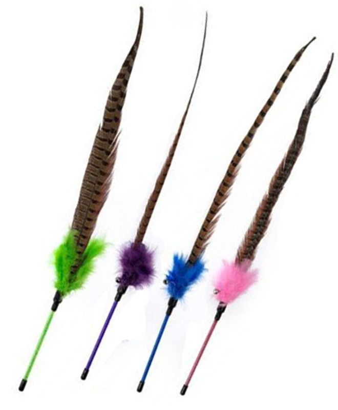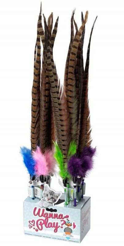 Supersnygg fjädervippa med pingla och färgglada dekorativa fjädrar vid skaftet, ca 50 cm lång. Rolig kattleksak både hemmavid och som extra fin vippa på kattutställning.