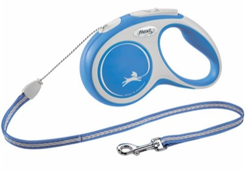 Flexikoppel Comfort med ett extra komfortabelt handgrepp för matte/husse som håller i kopplet. Flexi, i blå och vit färg, är ett enkelt och funktionellt rullkoppel med en bra längd på 5 meter.