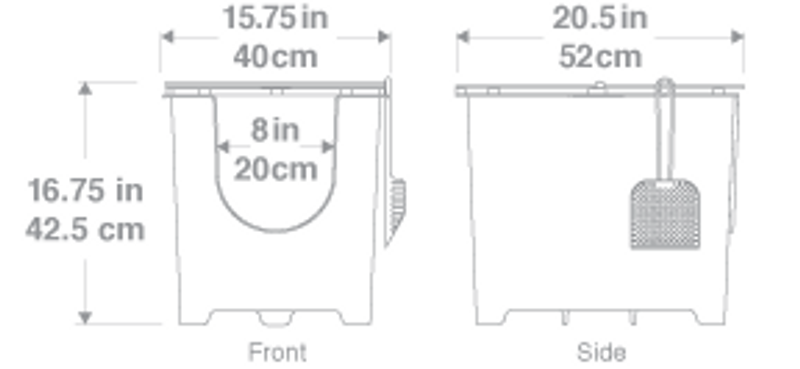 Flip är 42 cm hög, 52 cm lång, 40 cm bred och kattens ingång i lådan är 20 cm bred. Kattlådan är tillräckligt stor för den genomsnittliga katten att bekvämt svänga runt och gräva inuti.