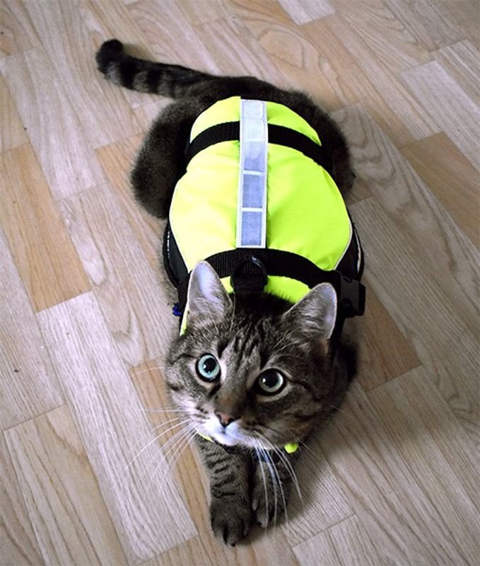 Flytväst till din katt som ökar säkerheten på båt och bland bryggor - om din katt följer med på semestern. Handtag på ryggen så att katten kan lyftas upp i ryggen på flytvästen om det skulle behövas ett snabbt lyft, t ex om katten håller på att hoppa från båt/brygga. Flytvästen har en D-ring för fäste av koppel på ryggen och bekväm omlottknäppning i halsen. Majavästen har reflexer på lyfthandtaget och UV-gult high visibility tyg för extra synlighet.