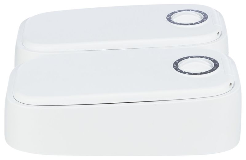 Timern säkerställer automatisk öppning av locket vid den inställda tiden. De två modulerna kan programmeras att öppnas samtidigt eller separat och rymmet 2 måltider om vardera 300 ml.