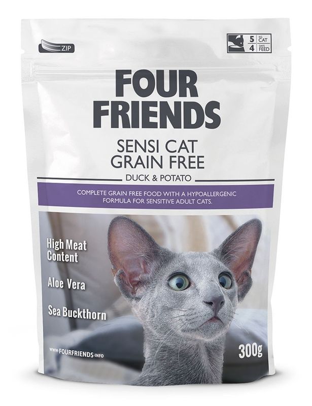 FourFriends Sensi Cat är ett spannmålsfritt torrfoder speciellt framtaget för vuxna katter med känsliga magar. SensiCat är gjort på 43 % rent, torkat ankkött som enda proteinkälla, och potatis som enda kolhydratkälla. Det här receptet innehåller alltså endast en proteinkälla, i stället för en blandning av olika, vilket gör det till ett prefekt val då man ibland kan man behöva byta proteinkälla av olika anledningar. Råvarorna är helt naturliga, utan kemiska konserveringsmedel och med en tillsats av Aloe Vera som bidrar till effektivare näringsupptag, medan havtornsextraktet bidrar till sunda urinvägar.