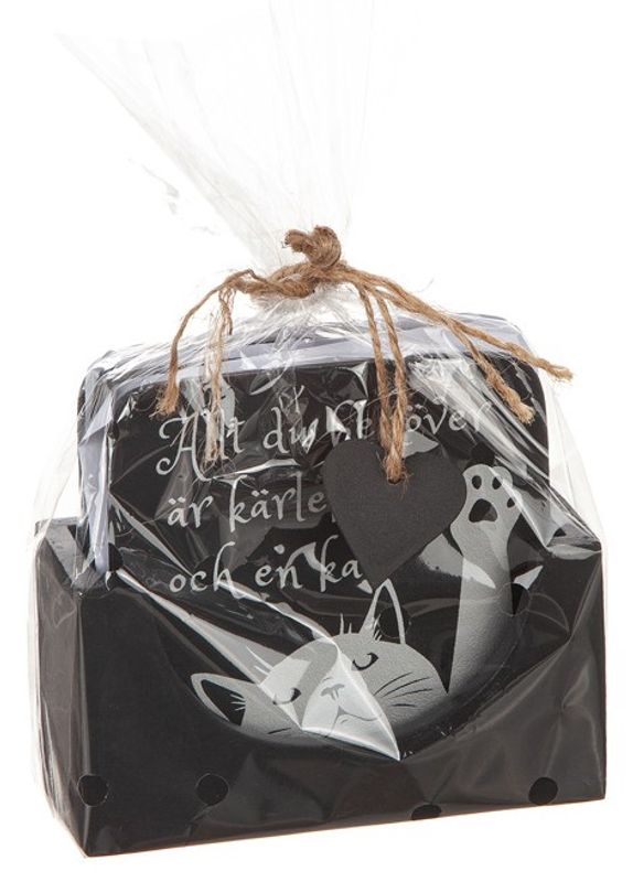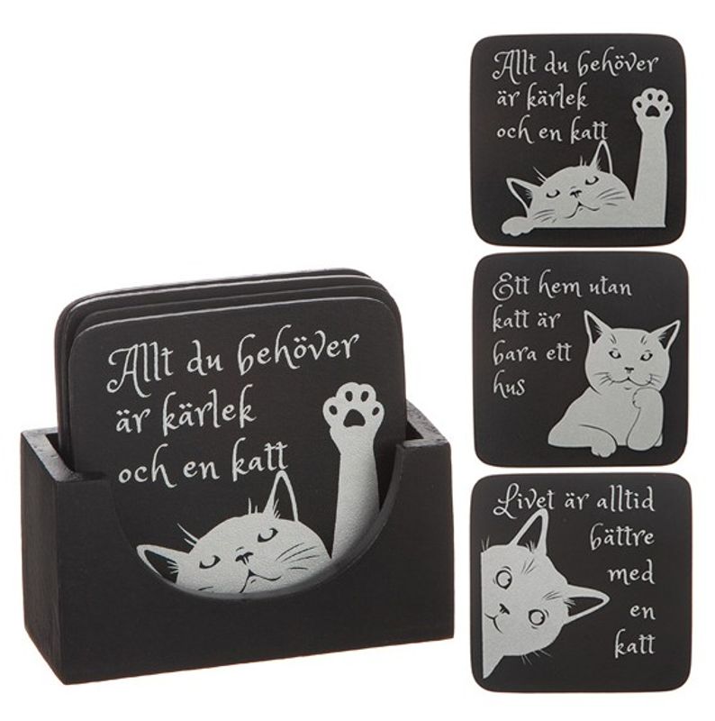 Handgjorda glasunderlägg i trä från märket Different Design. 4-pack med 4 st olika kattmotiv samt hållare. Glasunderläggen är svarta med vitt motiv.