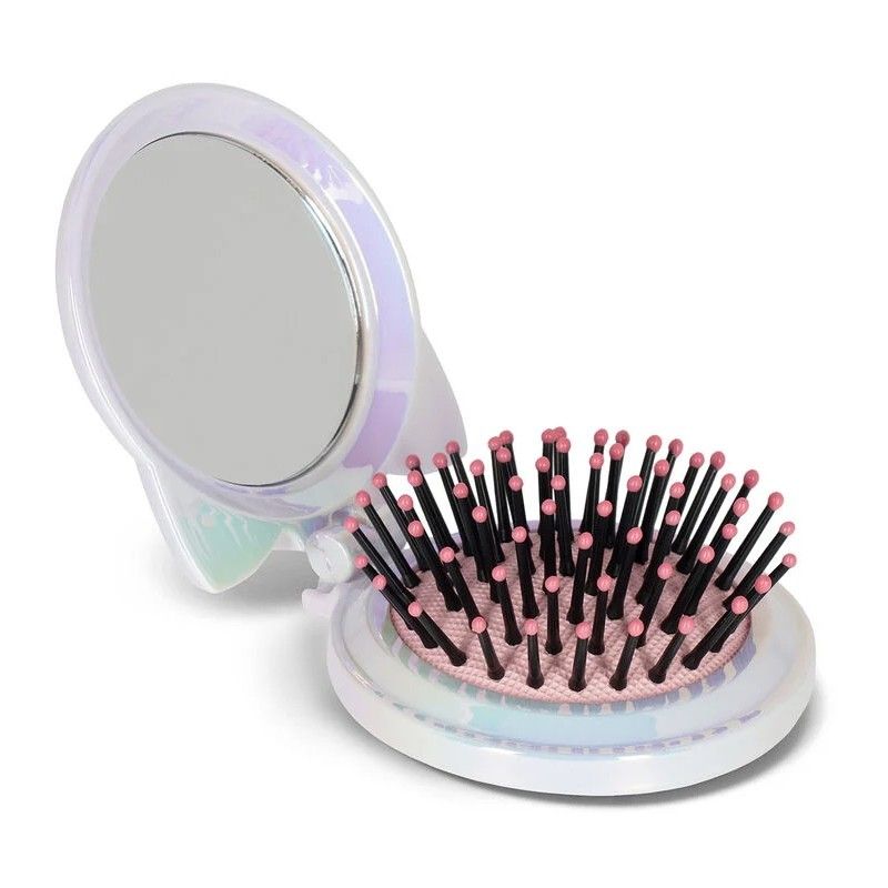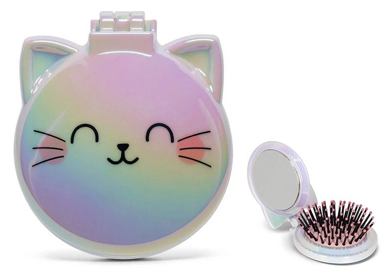 Hårborste med kattmotiv, som går att fälla ihop så den tar minimalt med plats i väskan. När locket fälls upp kan borstens taggar tryckas ut. Spegel finns på insidan av locket. Perfekt att ha med på språng!