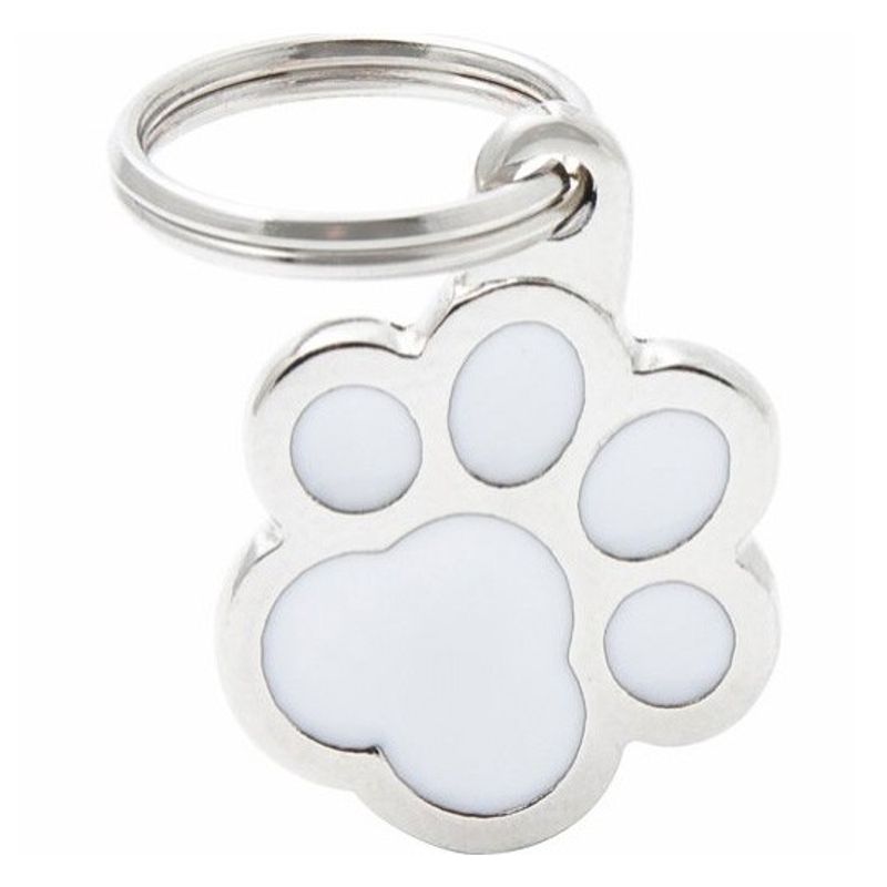 Id-bricka i form av en tass i metall och vit dekorfärg. Id-tag i en perfekt storlek att hänga på kattens halsband (ej tung eller för stor). Vi graverar en text som du väljer, kattens namn eller ett telefonnummer. Perfekt med ett telefonnummer om din katt har kommit bort, någon hittat den och behöver komma i kontakt med dig som ägare.