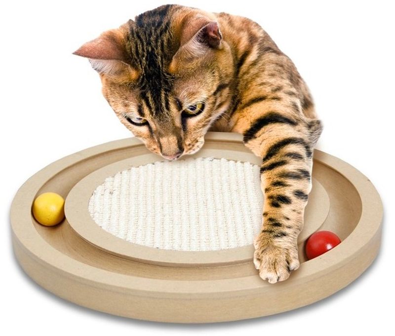 Kattleksak i trä till din katt med både bollbana med 2 st träkulor samt klösmatta ovanpå. Riktigt bra kvalité och perfekt för dig som gärna undviker plast i hemmet.