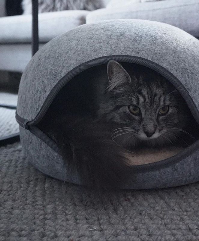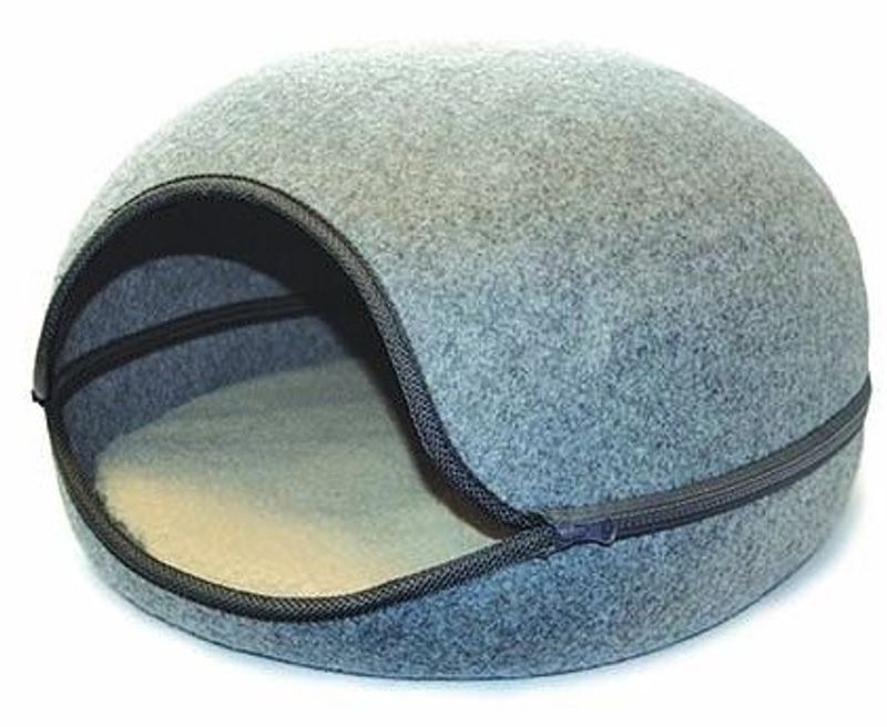Stor kattsäng i ljusgrå filtad look. Igloon kan delas av med en dragkedja och användas hel som en igloo eller med enbart underdelen som en snygg kattsäng.
