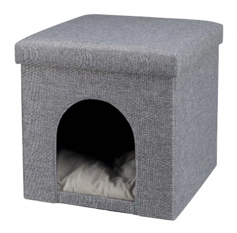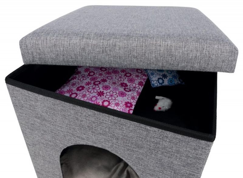 Kattgömma i grå färg som även är en snygg inredningsdetalj i ert hem. Din katt kan välja att ta sin catnap inuti sin Kattbox på den mjuka dynan som medföljer eller ligga ovanpå sin möbel. Lyfter man på locket så hittar man en smart och gömd förvaringsplats för kattens leksaker.