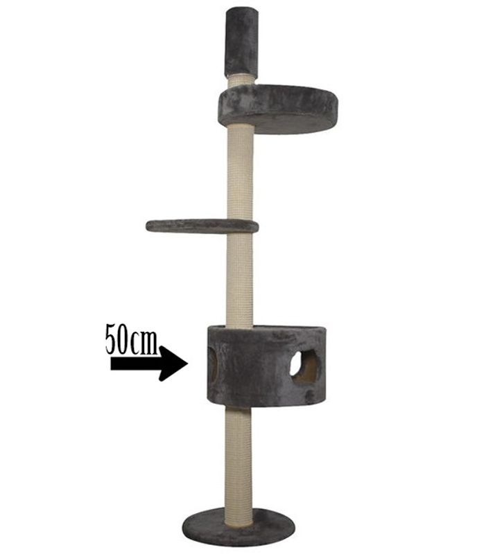 Rund grotta i 3 olika storlekar med svart plyschtyg både ovantill och under botten på hyllan. Förborrade hål som passar till alla klösträd från märket Kattens No.1.
