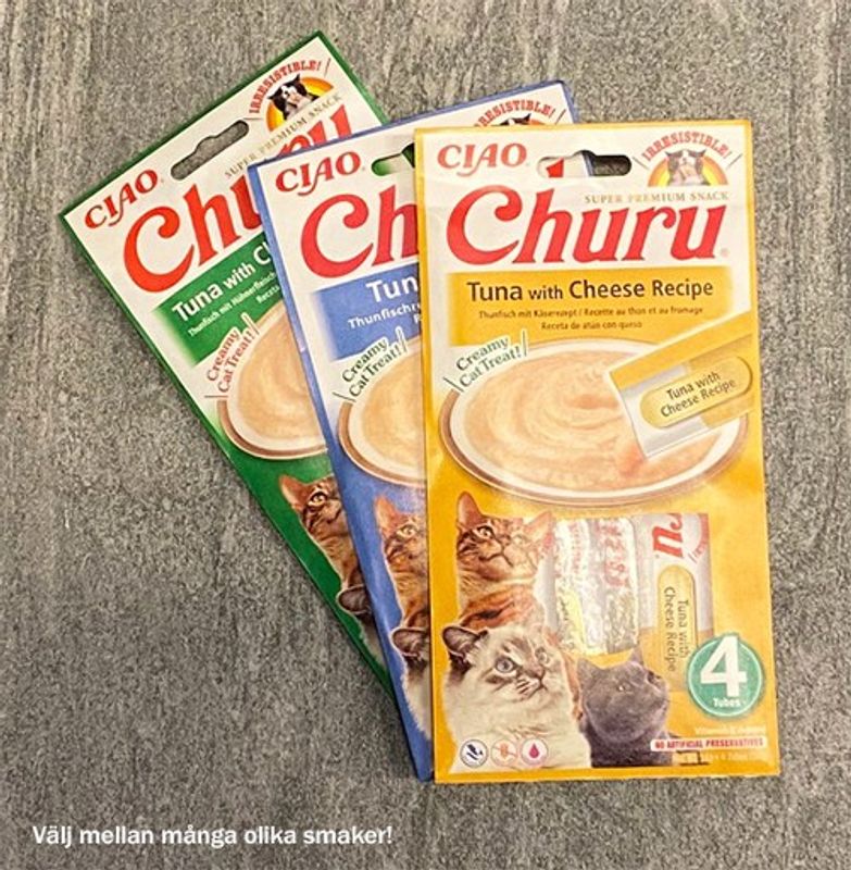 Churu Creamy-serien är tillverkade av vildfångad tonfisk. Churu tillverkas med ingredienser av livsmedelsgodkänd råvara. Churu Creamy finns i flera läckra smaker om din katt gillar ombyte!