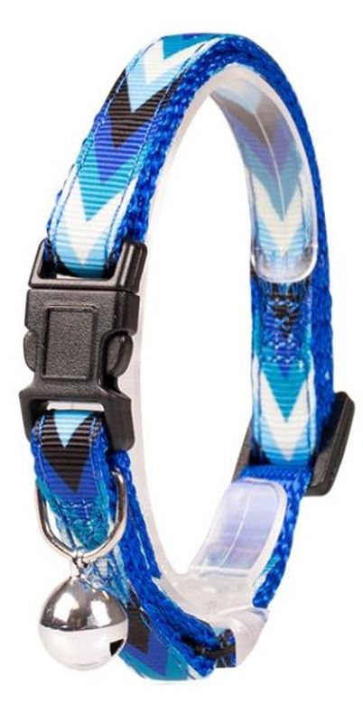 Katthalsband i mjuk mönstrad nylon med både safetyspänne och resårdel. Halsbandet finns i 2 olika färger, ett lila och ett blått.