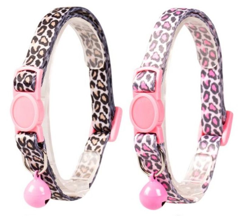 Katthalsband i snygg design till din katt, tillverkat i mjuk leopardmönstrad nylon med dekorativa rosa detaljer.