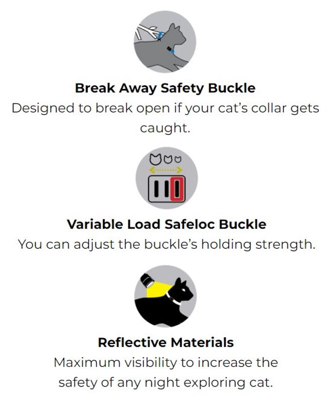 Spännet kan justeras efter kattens storlek och vikt och utlöses om katten skulle fastna utomhus, i och med att man kan ställa in kattens vikt så löses inte spännet ut för lätt och risken att katten tappar halsbandet utomhus utan att sitta fast minskar.
