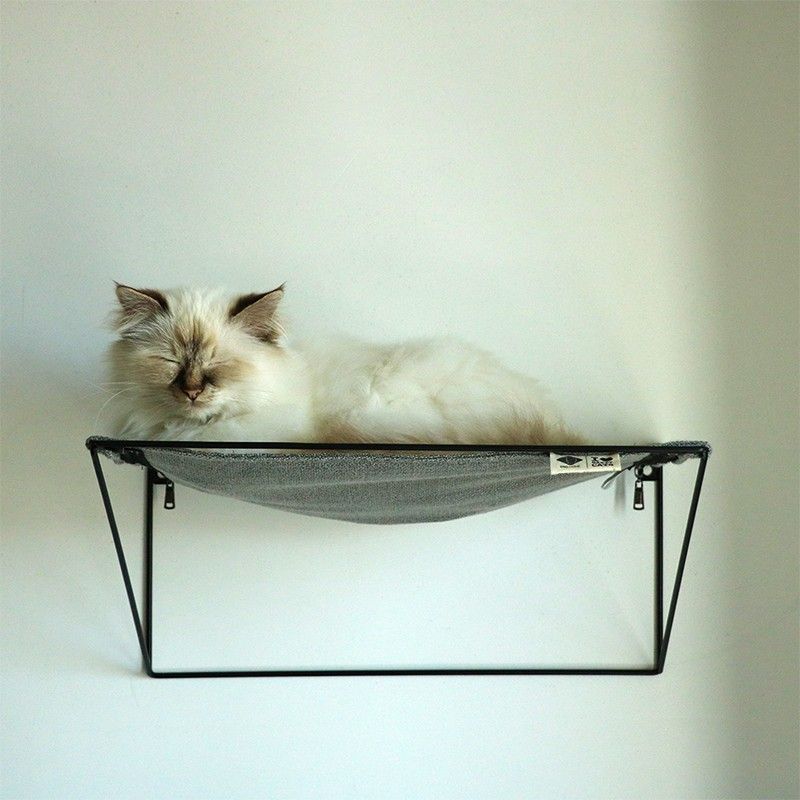 Hängmattan är gjord av ett snyggt inredningstyg och kan fästas på ramen med dragkedjor (tyget har en maxvikt på ca 10 kg). Trevligt tips! Att använda väggar för att ge dina katters sovplatser är så givande och ger dina katter en chans att kunna röra sig på en större yta och därmed få ett större revir.