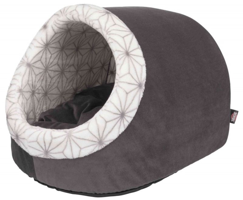 Kattigloo i en stilren och mysig design, grå färg med fint mönster på insidan av igloon. Bottendynan inuti är vändbar och mjuk, dynan har en grå sida och en ljus mönstrad sida.