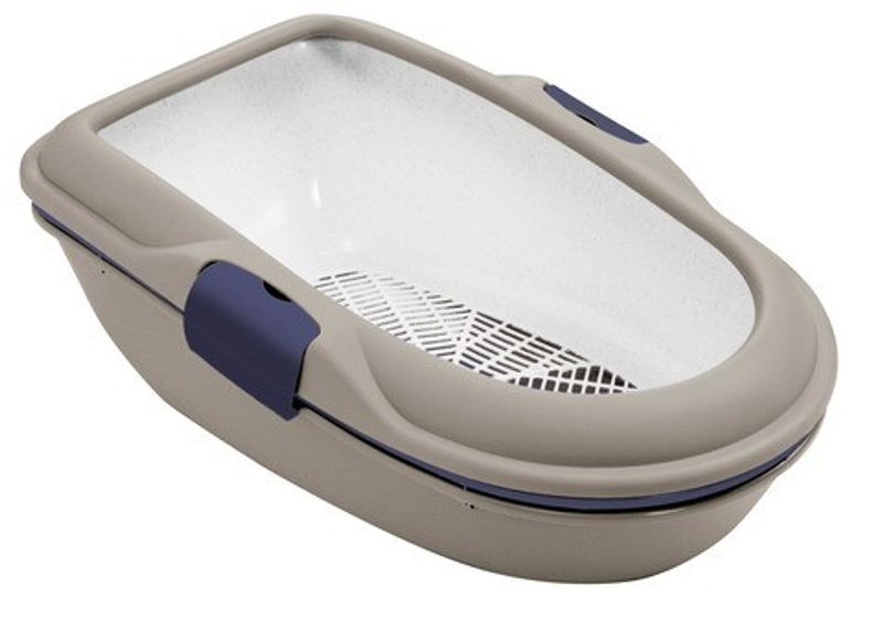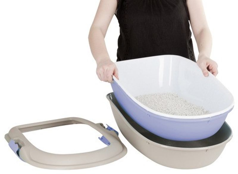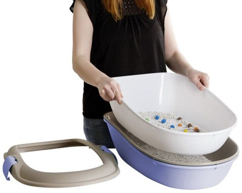 Kattlåda med 3 bottnar varav den ena botten har ett nät som gör att den fungerar som en sil. Kattlåda 3-bottnad med sil i färgen beige/marinblå gör den dagliga rensningen till en snabb och enkel procedur och ingen spade behövs. Videon nedan visar hur du enkelt tömmer kattlådan.